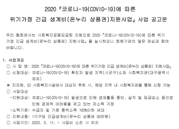 [마감] 2020 코로나-19에 따른 위기가정 긴급 생계비(온누리 상품권) 지원사업