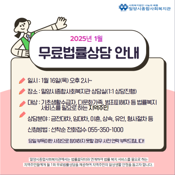 [안내 및 모집] 1월 무료법률상담 게시글 작성정보 작성자 밀양시종합사회복지관 작성일 25-01-03 11:56 조회수 356 댓글수 0 목록 게시글 본문 [안내 및 모집] 1월 무료법률상담 첨부파일 1개 무료법률25.01.png (97.1K) 3회 다운로드 첨부일시 : 2025-01-03 11:56:58 이전글 [안내 및 모집] 2월 무료법률상담 25-01-20 다음글 [모집] 사회교육프로그램 수강생 모집 25-01-02 댓글 0 등록된 댓글이 없습니다. 목록